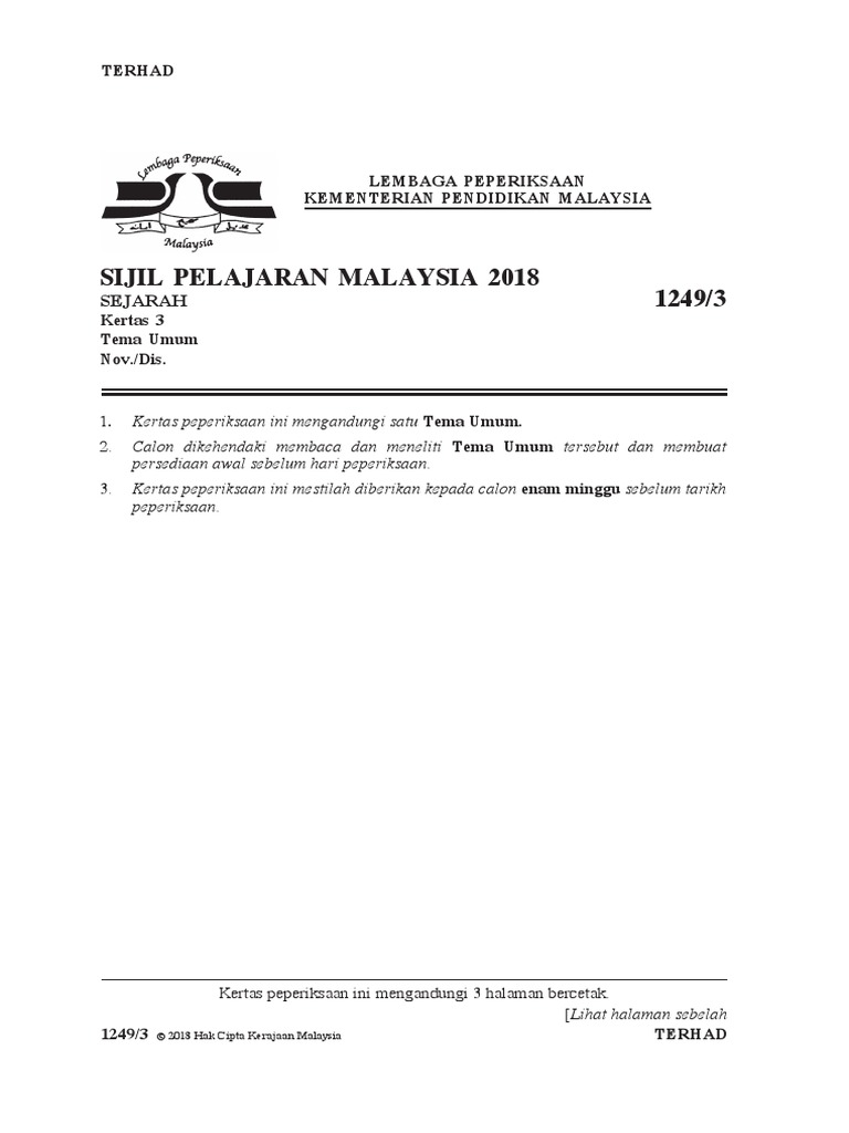 Menurut sumber rasmi yang dikeluarkan oleh Lembaga Peperiksaan Malaysia LPM tema umum subjek Sejarah Kertas 3 12593 peperiksaan SPM 2018 berjudul Pembinaan Negara dan Bangsa Ke Arah Kemunculan Negara Malaysia Berdaulat. Tema Umum Sejarah Kertas 3 SPM 2018. 2018 SPM SEJARAH KERTAS 3 CONTOH DAN BAHAN RUJUKAN SET 1 Aspek Perincian Markah Pengenalan 1.